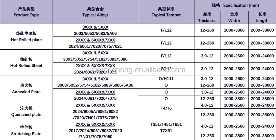 2)Temper: | O/H12/H14/H16/H18/H32/H34/H36/H38//H111/H112/H116/H321/T6/T651/T3/T351 etc |