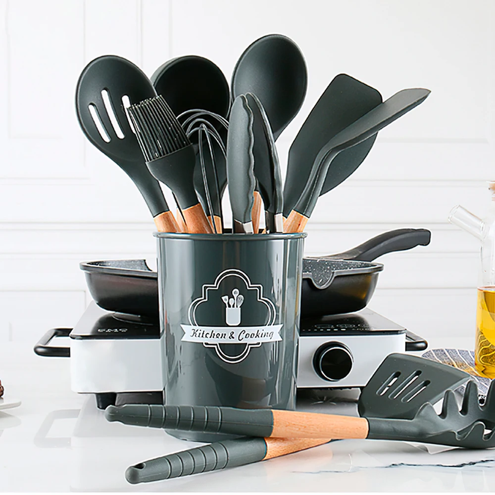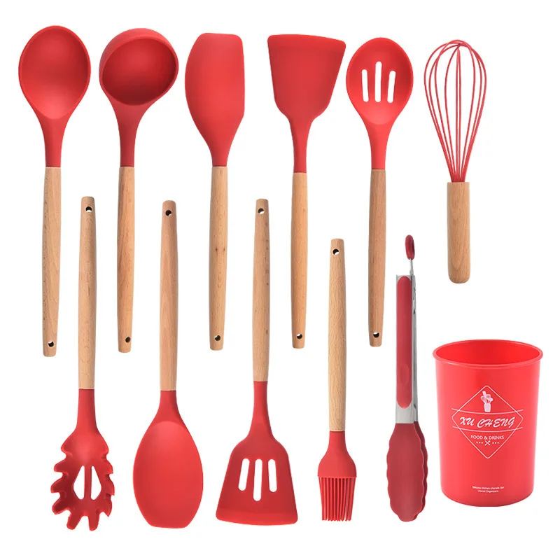Силиконовые кухонные принадлежности набор кухонных принадлежностей с деревянными ручками Кухонные силиконовые горячие 12 штук в 1 Набор бамбука