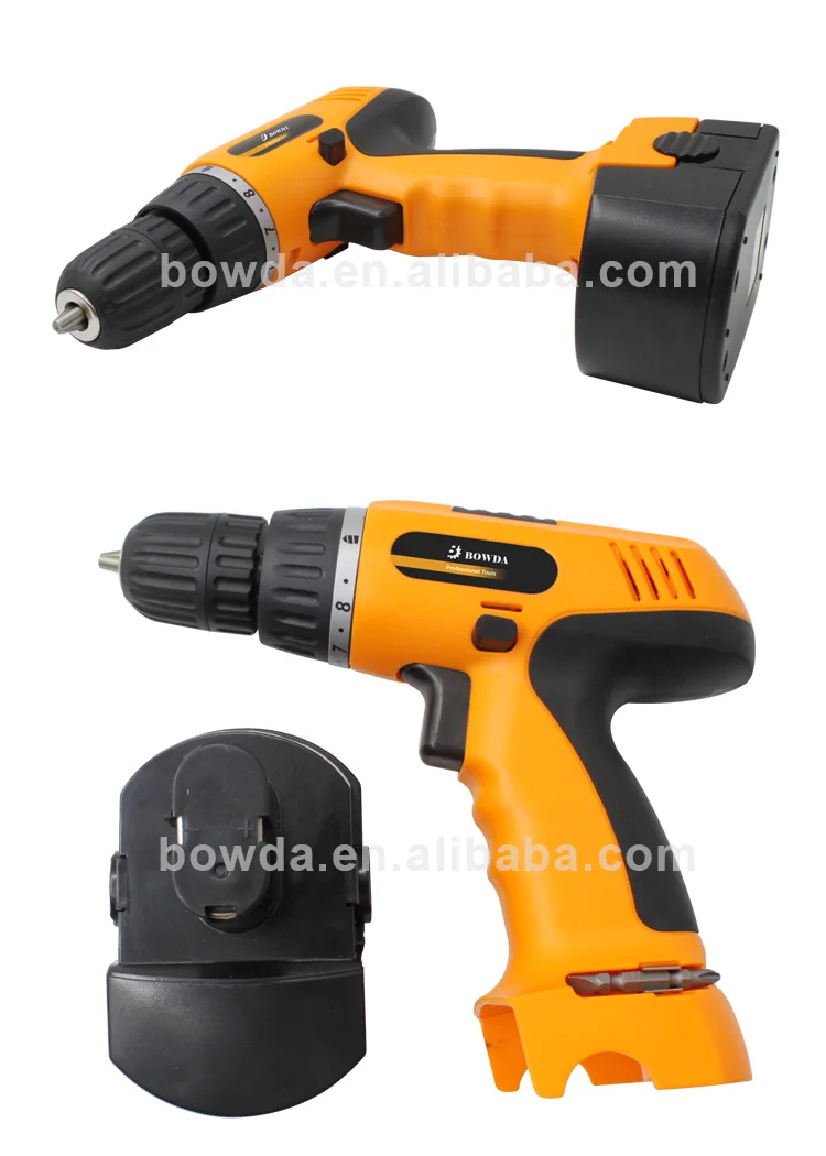 The cordless drill with 2pcs Bits, Ni-Cd/Ni-Mh/Li-ion battery, torque adjustment, variable switch.