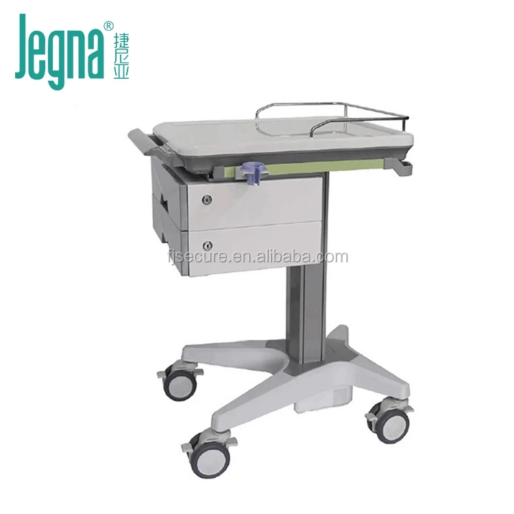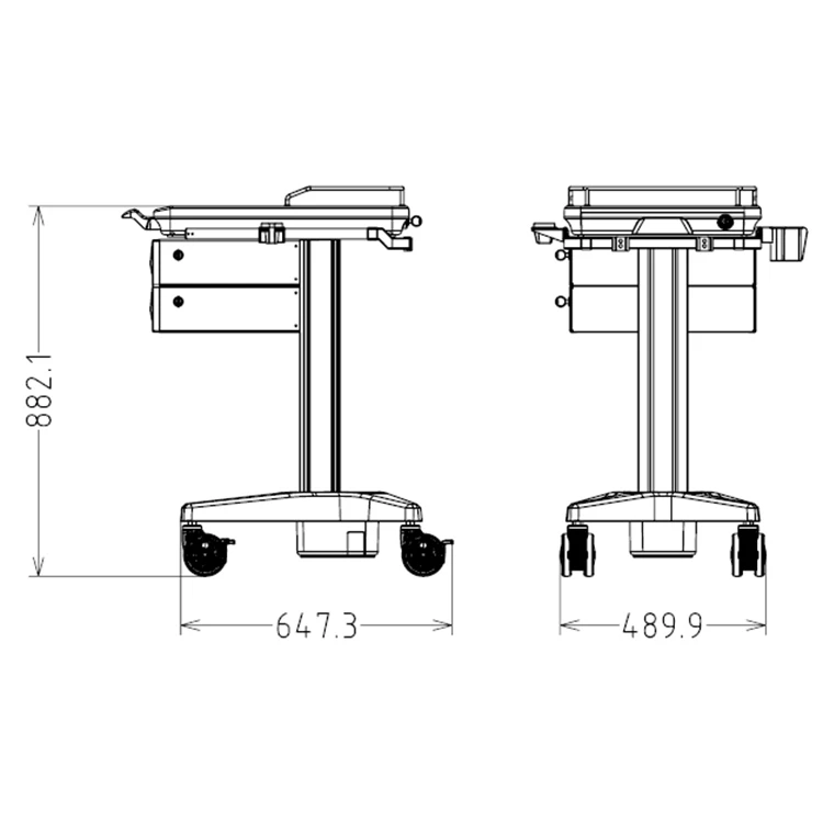 | Description | 1. The fixed aluminum alloy column structure, ABS plastic surface load 10Kg 2. Worksurface height:880mm,smooth ABS worksurface dimension:608mm(L)×470mm(W) 3. There is a lockable Laptop(14 inch) cabinet 4. Two layers medicine drawer,each layer with a lock 5. Fence with hangers(include a scanner gun holder,a probe frame) 6. Base:PA6 + ABS cover 7. Silent medical casters |