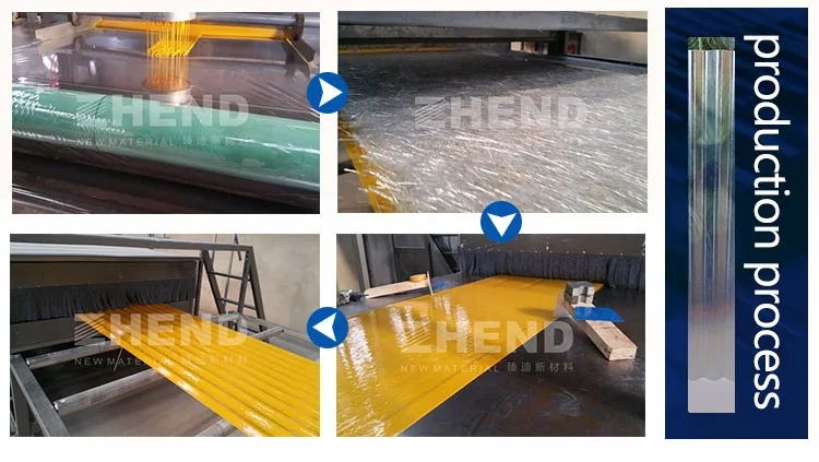using high quality polyester resin,high-grade non alkali glass fiber mat or twistless fiberglass chopped yarn as raw material,through the automatic continuous traction unit,uniform heating oven temperature control by computer,high temperature curing molding.Product surface smooth,stable size,color optional,arbitrary length.
