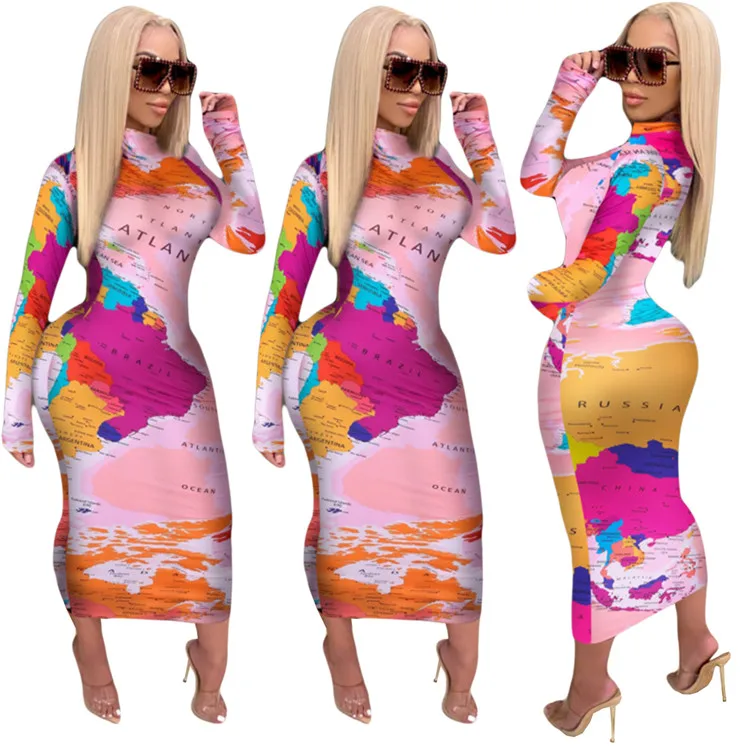 EB-2012010636 2021 модная повседневная женская одежда с длинным рукавом с принтом карты мира плюс размер весеннее женское облегающее Макси платье
