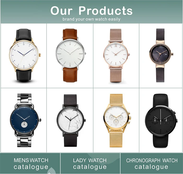 Мы можем удовлетворить различные потребности клиентов, включая различные корпуса (нержавеющая сталь, медь, сплав), циферблат (медь, мрамор, корпус, зерно CD), ремешок (нейлон, сетка, кожа, ПУ, цепь), механизм (китайский, японский, швейцарский, механический механизм), личная упаковочная коробка.