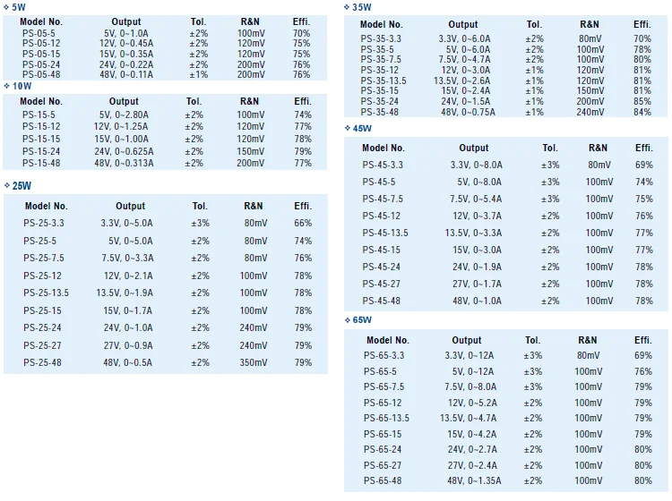 | MODEL | PS-05-5 | PS-05-12 | PS-05-15 | PS-05-24 | PS-05-48 | |