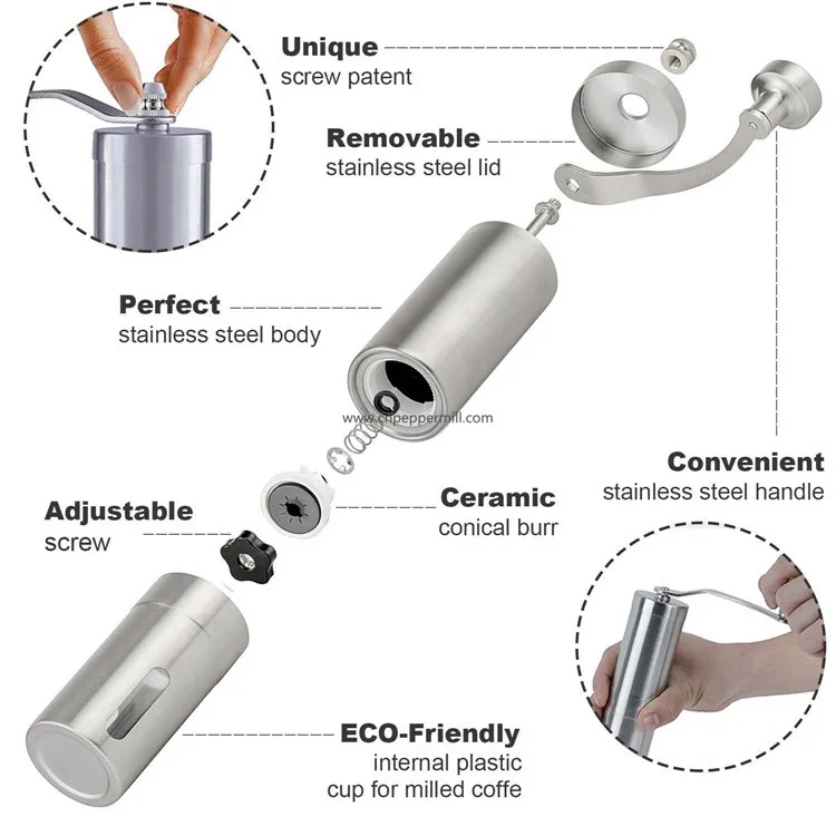 •\tFRESH COFFEE ANYWHERE AT ANY TIME – wherever you are (at home, in the office or on a trip) you will always be able to enjoy the taste of freshly ground coffee with our camping coffee grinder because it doesn't not require electricity of batteries.