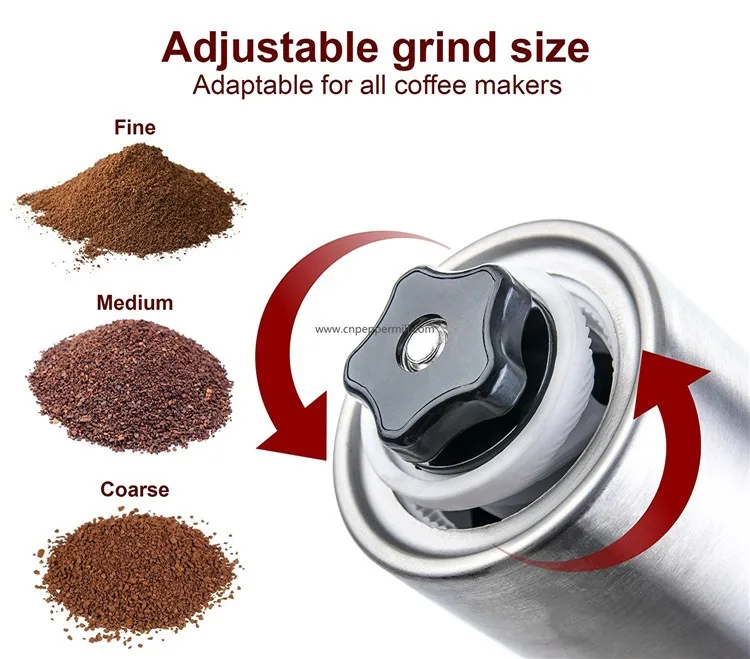 •\tIMPROVED ADJUSTABLE GRIND SELECTOR in our manual burr coffee grinder with more than 16 click settings makes the process of grind-size selecting even more precise than previously. Just turn the selector clockwise or counterclockwise and choose one from the following grinding profiles: Extra fine grind, Fine grind, Medium coarse grind, Coarse grind, Medium fine grind, Extra coarse grind.