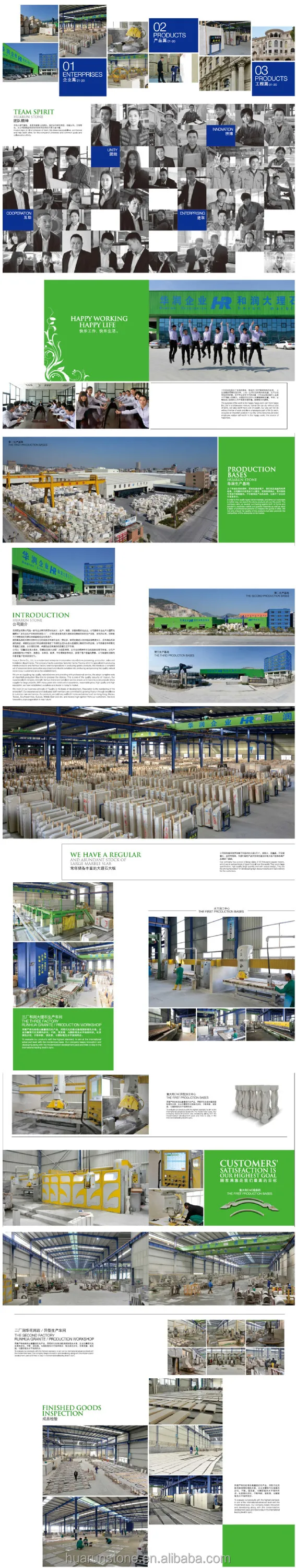 We insist on our business principle of "Quality is the basis of development, Reputation is the everlasting of the enterprise". Our experience and dedicated staff members are committed to growing HUARUN STONE through excellence in customer care and service. Our products are sold very well both home and abroad such as Hong Kong, Taiwan, Southeast Asia, Europe, Middle East and etc. and receive high opinion from our customers.