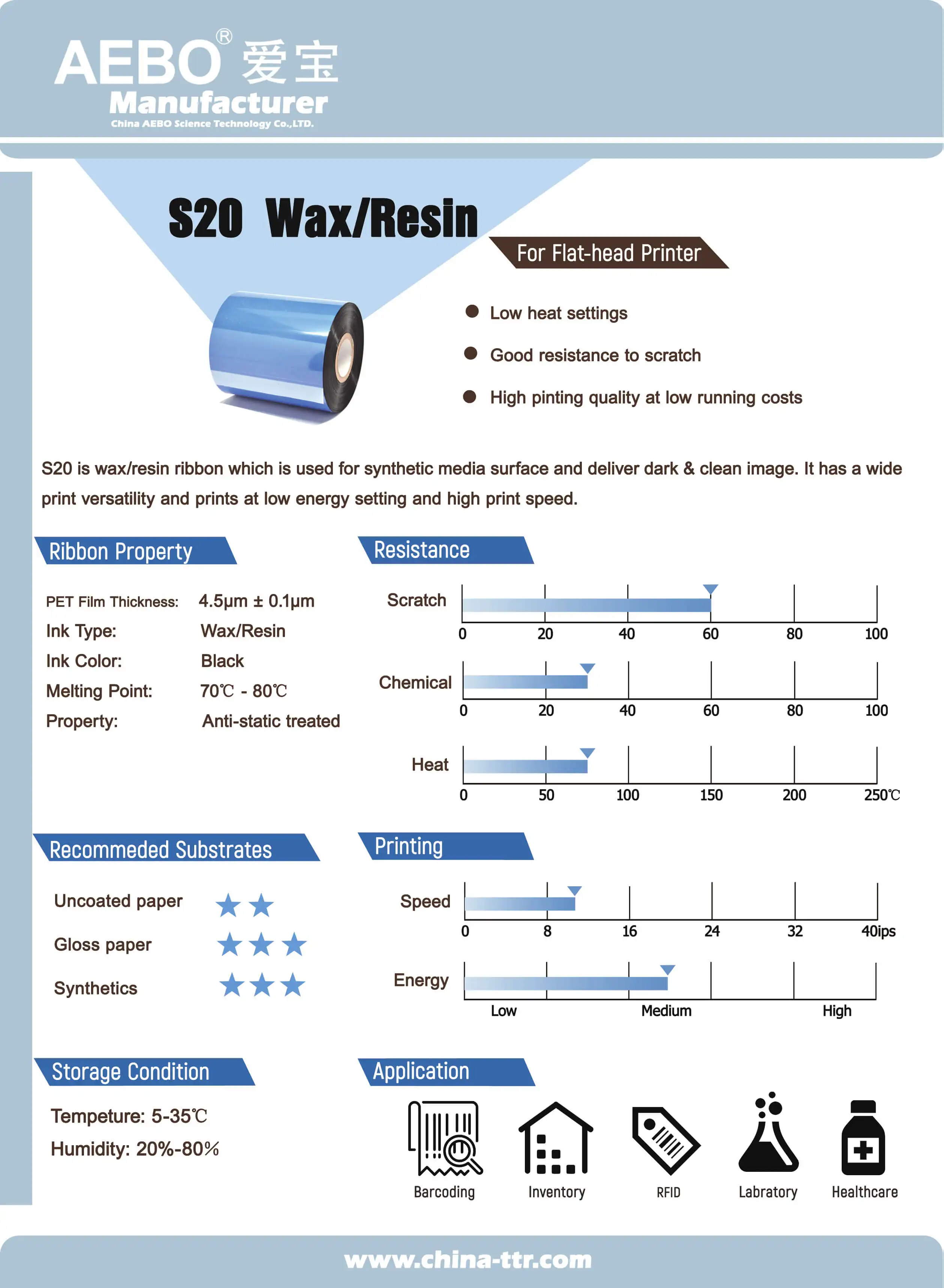 It is general purpose wax ribbon which is widely used for standard label printing. It has low print-head energy requirement and average smudge and solvent resistance at low running costs. The back-coat technology provides the anti-static property that extends print head life time.
