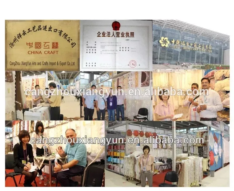 Cangzhou Xiangyun Artware I & E Co., Ltd. is located in Cangzhou, Hebei and is specialized in manufacturing table cloth, curtain, carpets, bed clothes and so on. With an experienced and professional team, we have exported our products to many countries and regions all over the world, especially Russia, Turkey, Poland, Israel, the Middle East and some other countries and regions. Our products enjoy a good reputation among our customers. We welcome customers, business associations and friends from all parts of the world to contact us and seek cooperation for mutual benefits.