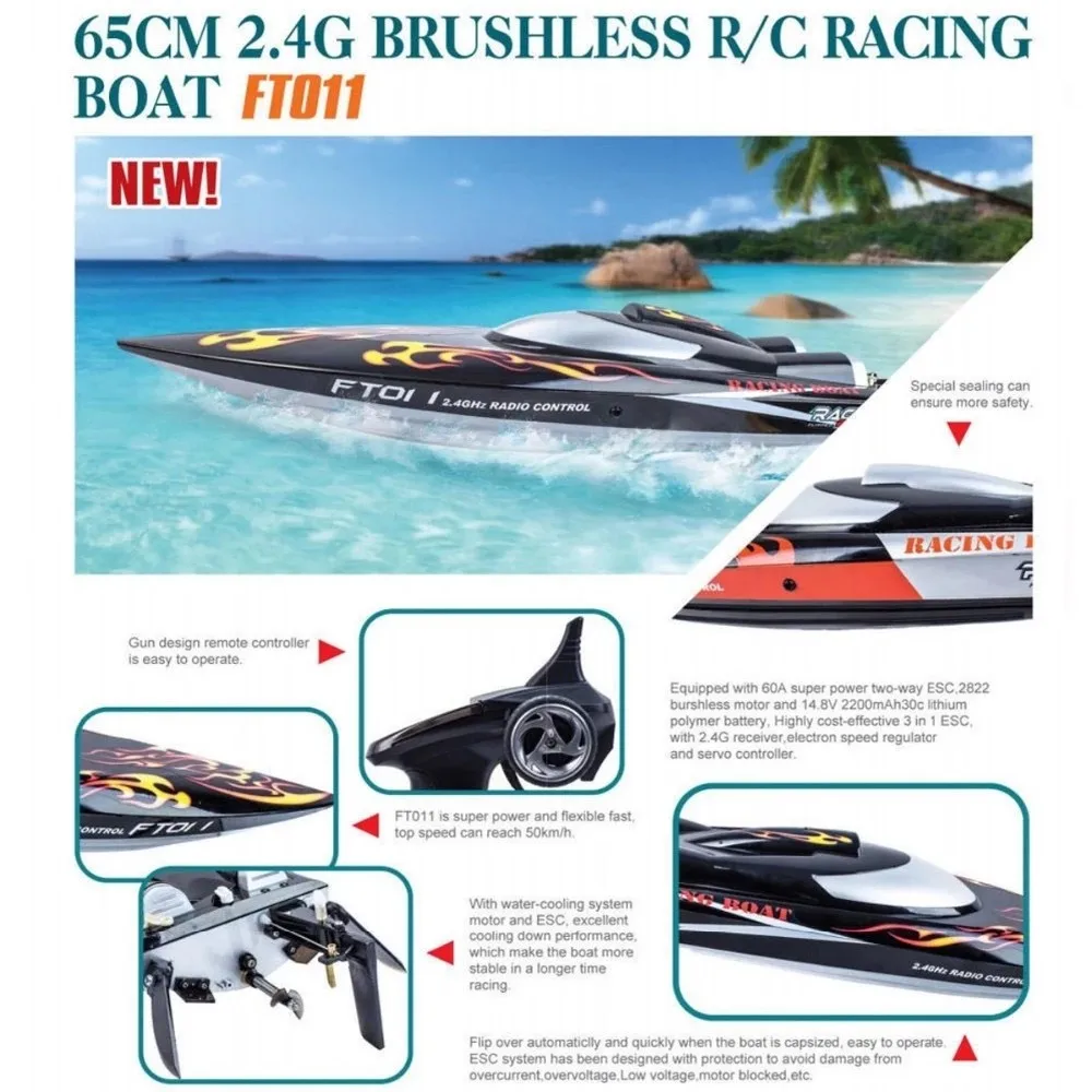 Large and swift, FeiLun FT011 brushless RC boat is so appealing. It is the awesome shark that can drift on the water in an impressive way. With its moving tail, the water flow will not affect its direction. You do not need to wait for the still water, the cabin is fully protected against water. In case it capsizes, FeiLun FT011 will automatically turn upward. Enjoy racing and the excitement that the RC boat brings to you!