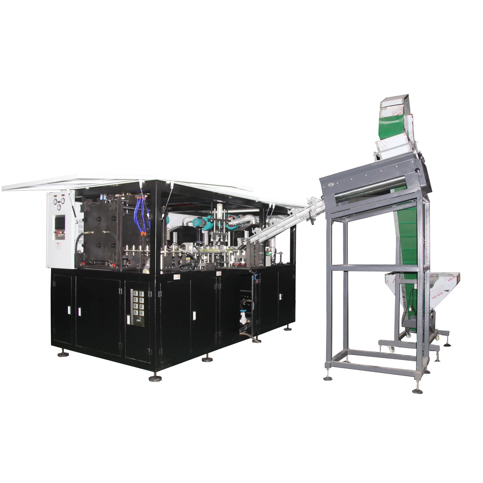 Automatic pet blow molding machine with preform loaded by hand and finished bottle taken out by robot arm.