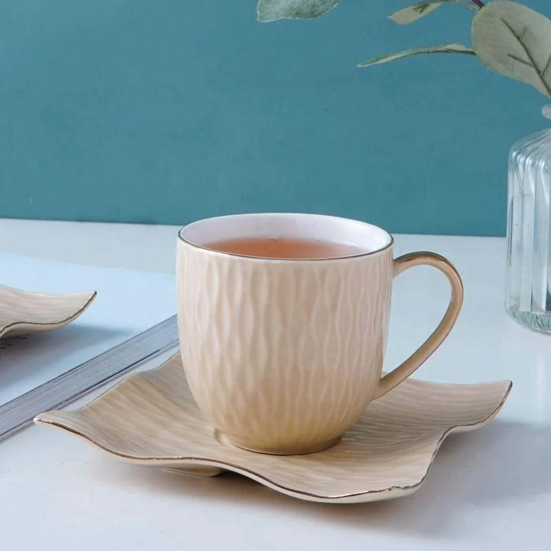 Custom Color Glaze Real Gold Design Shiny Beige Ceramic Mug Porcelain Tea Coffee Cup Set