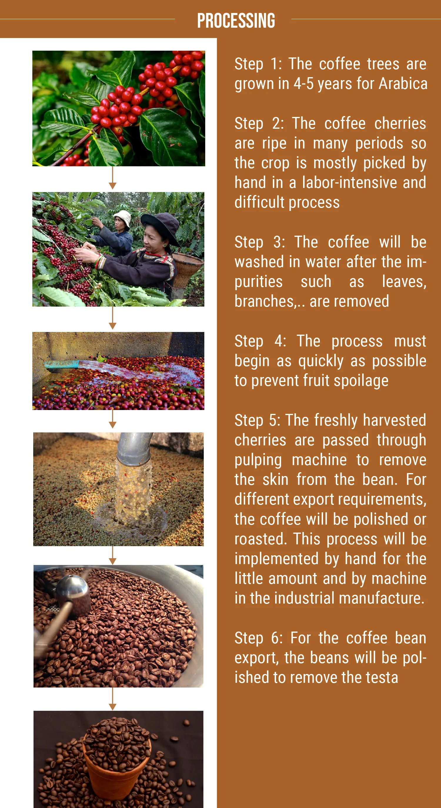 Coffee trees are pruned short to conserve their energy and aid in harvesting, but can grow to more than 30 feet (9 meters) high. Coffee cherries grow along the branches and it takes nearly a year for a cherry to mature after first flowering, and about 5 years of growth to reach full fruit production. Coffee Arabica is descended from the original coffee trees discovered in Ethiopia. These trees produce a fine, mild, aromatic coffee and represent approximately 70% of the world’s coffee production. The beans are flatter and more elongated than Robusta and lower in caffeine. The most important factor is that temperatures must remain mild, ideally between 59-75 degree Fahrenheit, with about 60 inches of rainfall a year. For roasting, it brings out the aroma and flavor that is locked inside the Arabica coffee beans because it causes chemical changes to take place as the beans are rapidly brought to very high temperatures. Once roasted, they should be used as quickly as possible before the fresh roast flavor begins to diminish.