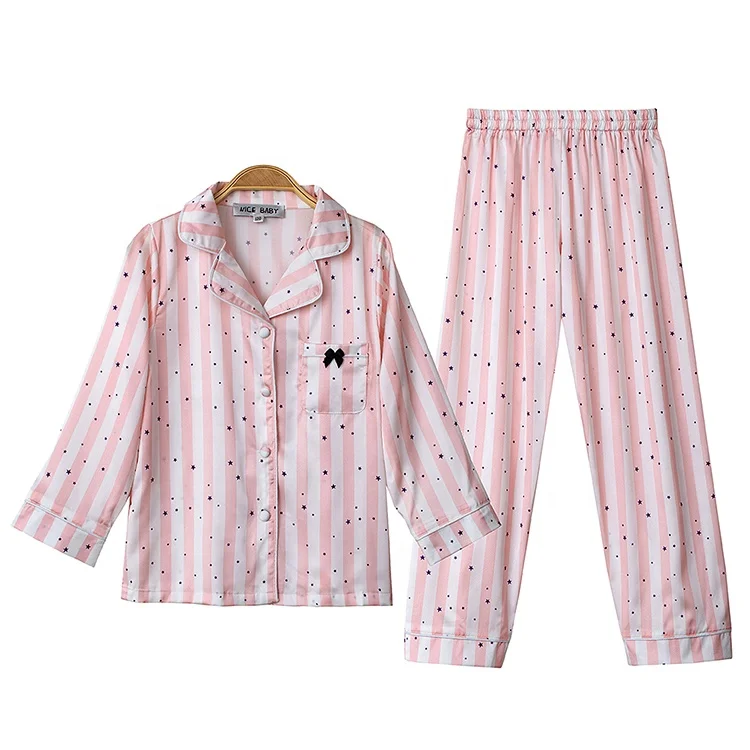 Новый дизайн, детская одежда в розово-белую полоску с принтом в виде маленькой звезды, одежда для сна для девочек из 2 предметов, атласная пижама