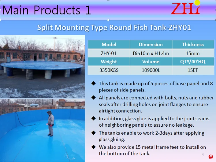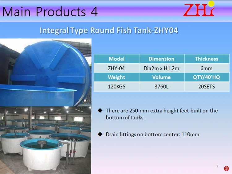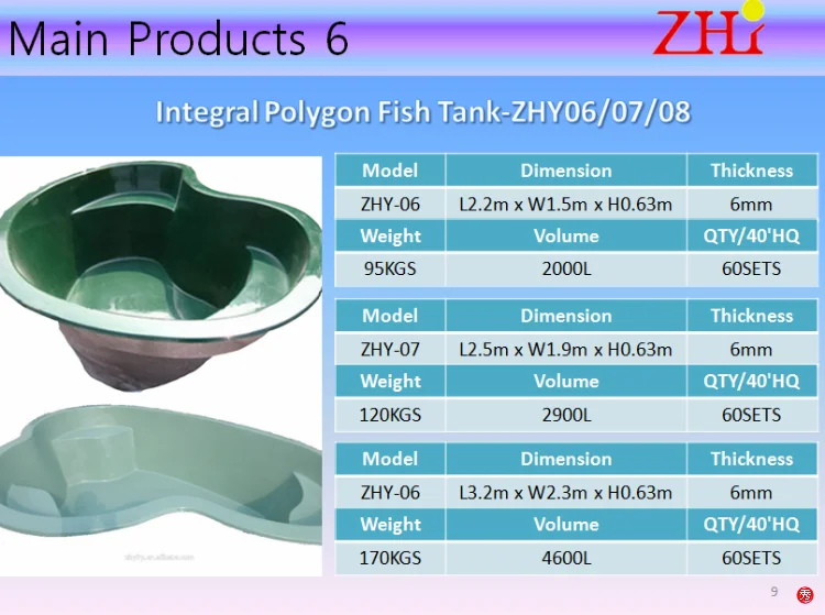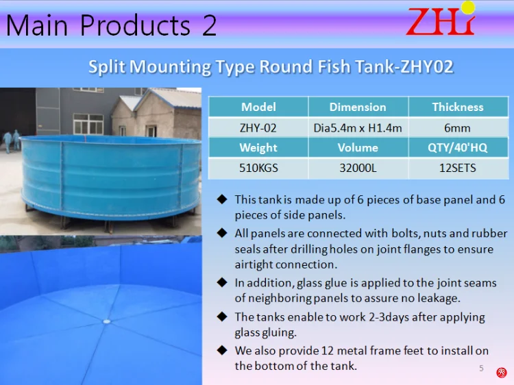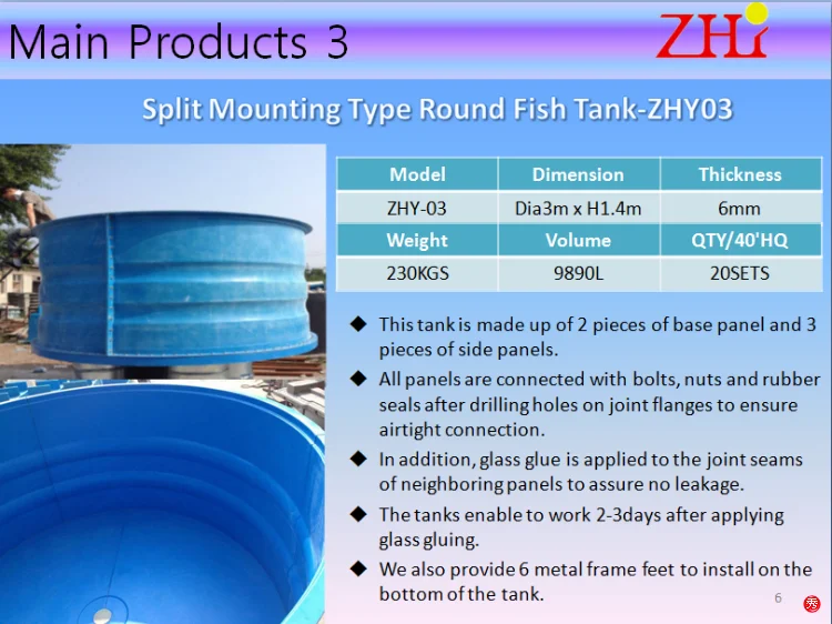 ZHY fiberglass fish tank come in sizes ranging from small tanks to 10m diameter tanks. These tanks can be used in a variety of aquaculture settings. Life cycle is at least 20 years. All tanks can also meet EU RoHS Directive 2002/95 / EC Rescinding Directive 2011/65 / EU restrictions.