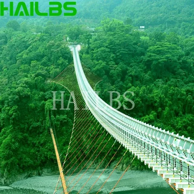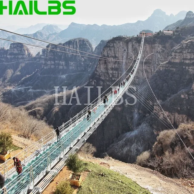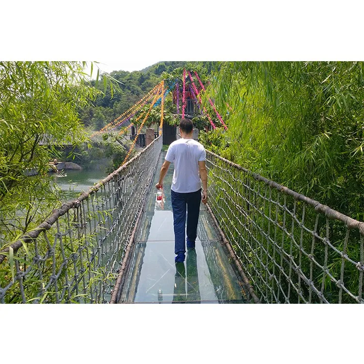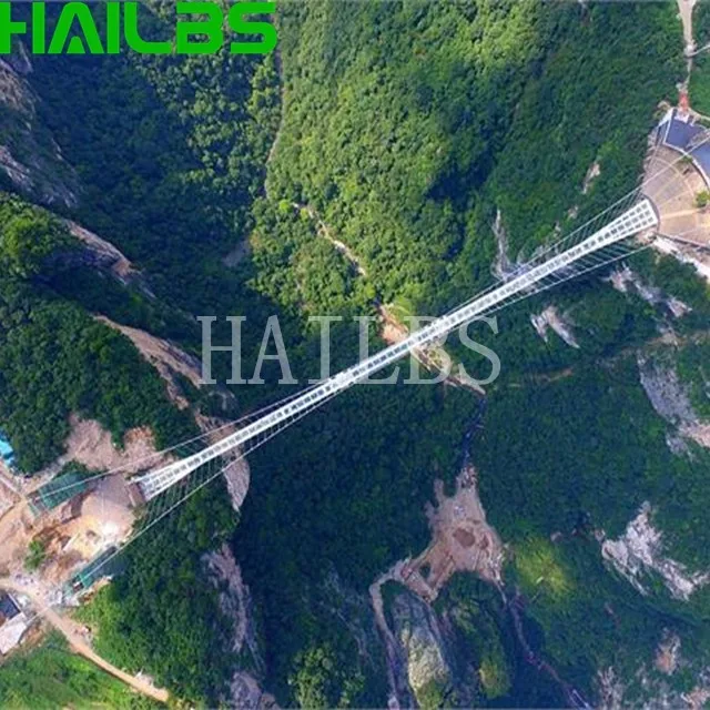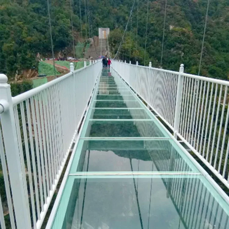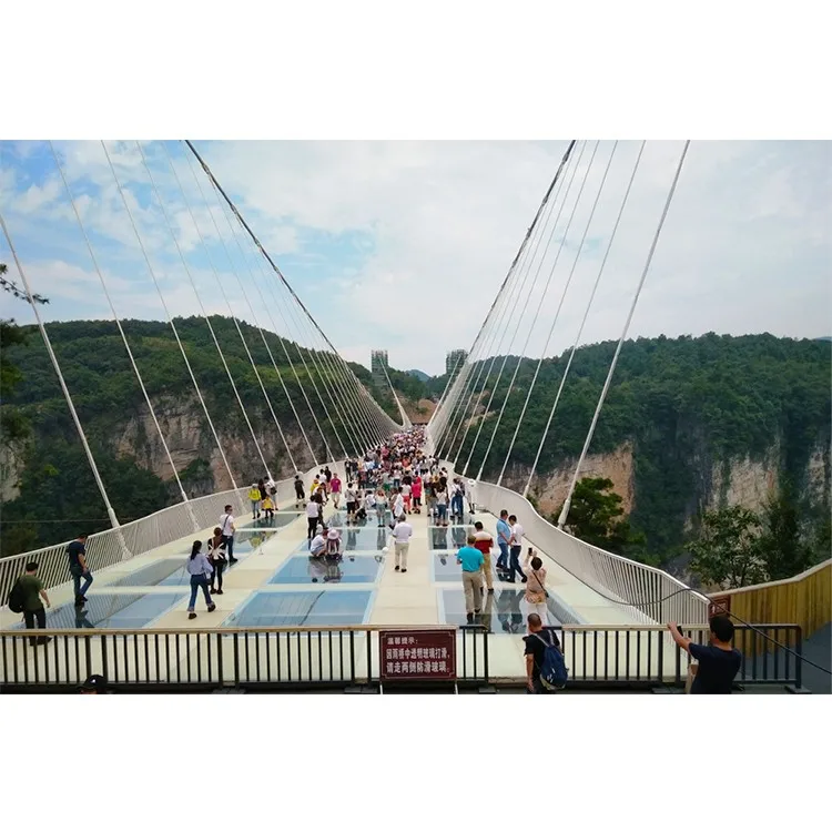 The bridge body is composed of two main steel wire ropes thick as arms and multi-base steel wire ropes. The weight of one main steel wire rope reaches 4 tons. The tension of each rope has been tested by sophisticated instruments to ensure the balanced force of each iron wire rope and ensure the safety of tourists.In order to increase the thrilling experience of tourists, the bridge deck of special glass fiber reinforced plastic (FRP), each of which is about 24mm thick, is double-layer structure with high strength, bending resistance, impact resistance and other characteristics, the strength of which is more than 25 times that of ordinary glass