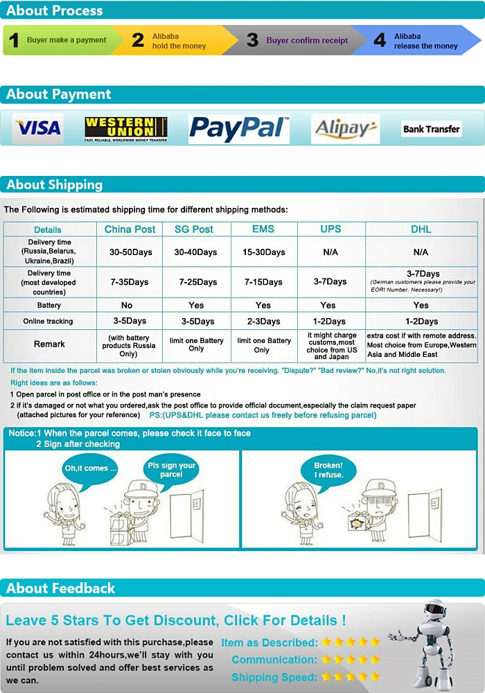 | Payment Terms | Paypal, T/T, Western Union, Money Gram, L/C, etc |