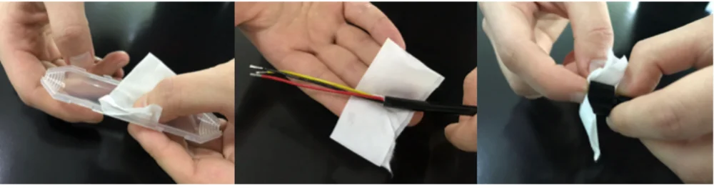 Cleaning Surfaces of mold or penetrator and cables. Thoroughly clean and wipe the section of cable jacket and mold or penetrator that will be in contact with glue, remember using gloves. The acetone will chemically attack the jacket surface, etching it and increasing surface roughness. This will ensure a good bond.