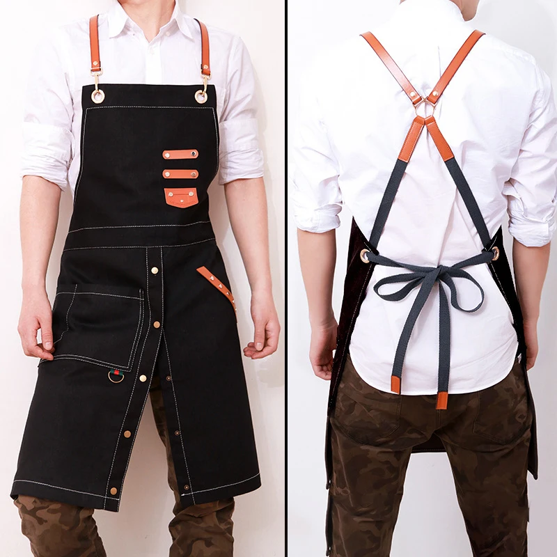 Высококачественный черный парикмахерский фартук с логотипом на заказ, прочные хлопковые брезентовые устойчивые к отбеливанию регулируемые перекрестные передние фартуки для бариста