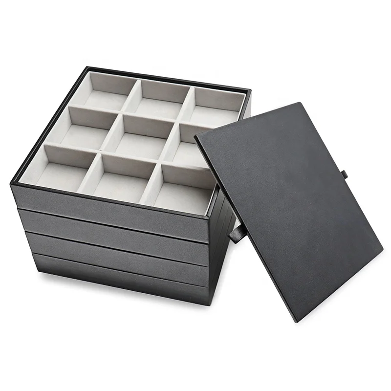 Розничная продажа, черный кожаный штабелируемый поднос для упаковки ювелирных изделий с крышкой