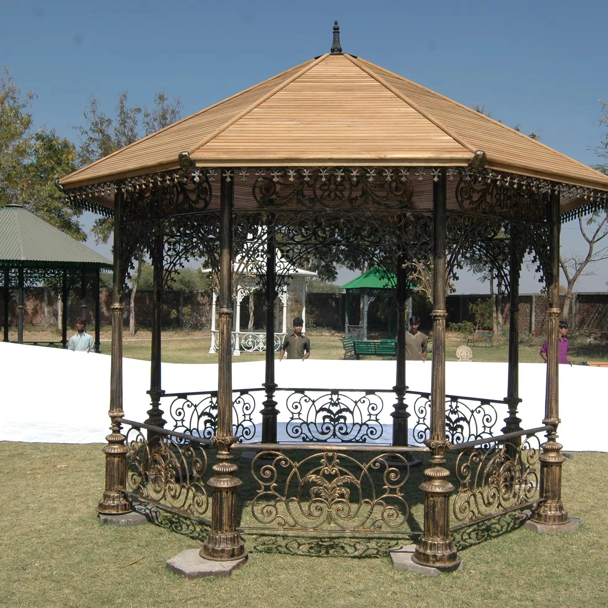 Коричневая чугунная восьмиугольная садовая беседка с декоративной аркой и столбом из металлического волокна кровля для парковых декоративных беседок