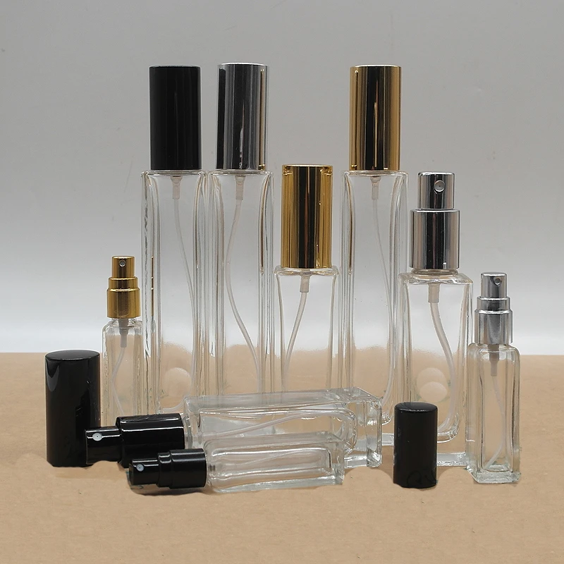 Прозрачный пустой стеклянный флакон для духов прямоугольной формы 30 мл 50 100 с распылителем трех цветов