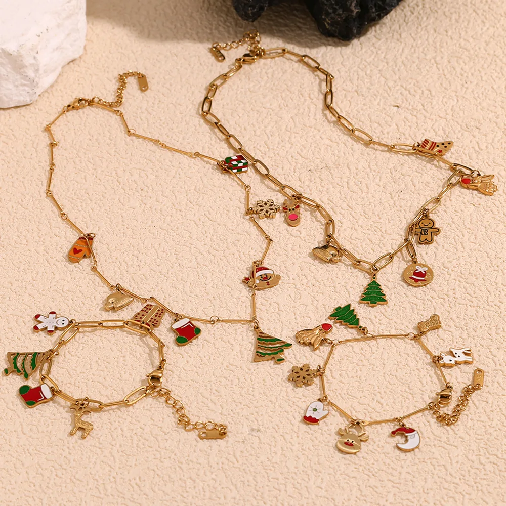 Американский милый мультфильм Санта-Клаус из нержавеющей стали 18K золото Рождественская шляпа кулон браслет ожерелье комплект ювелирных изделий