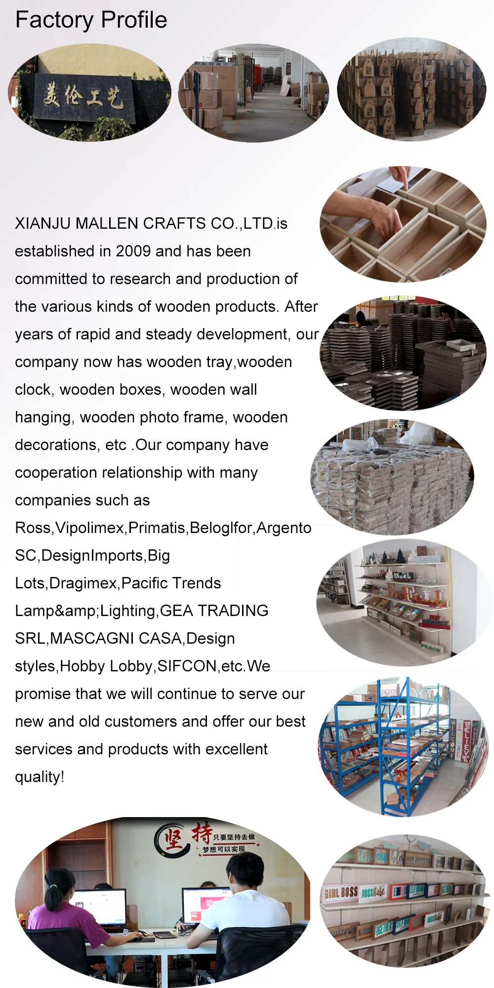 XIANJU MALLEN CRAFTS CO.,LTD. Основана в 2009 году и занимается исследованиями и производством различных видов деревянных изделий. После многих лет быстрого и стабильного развития, наша компания теперь имеет деревянный поднос, деревянные часы, деревянные коробки, деревянные настенные подвесные, деревянные фоторамки, деревянные украшения и т. Д.