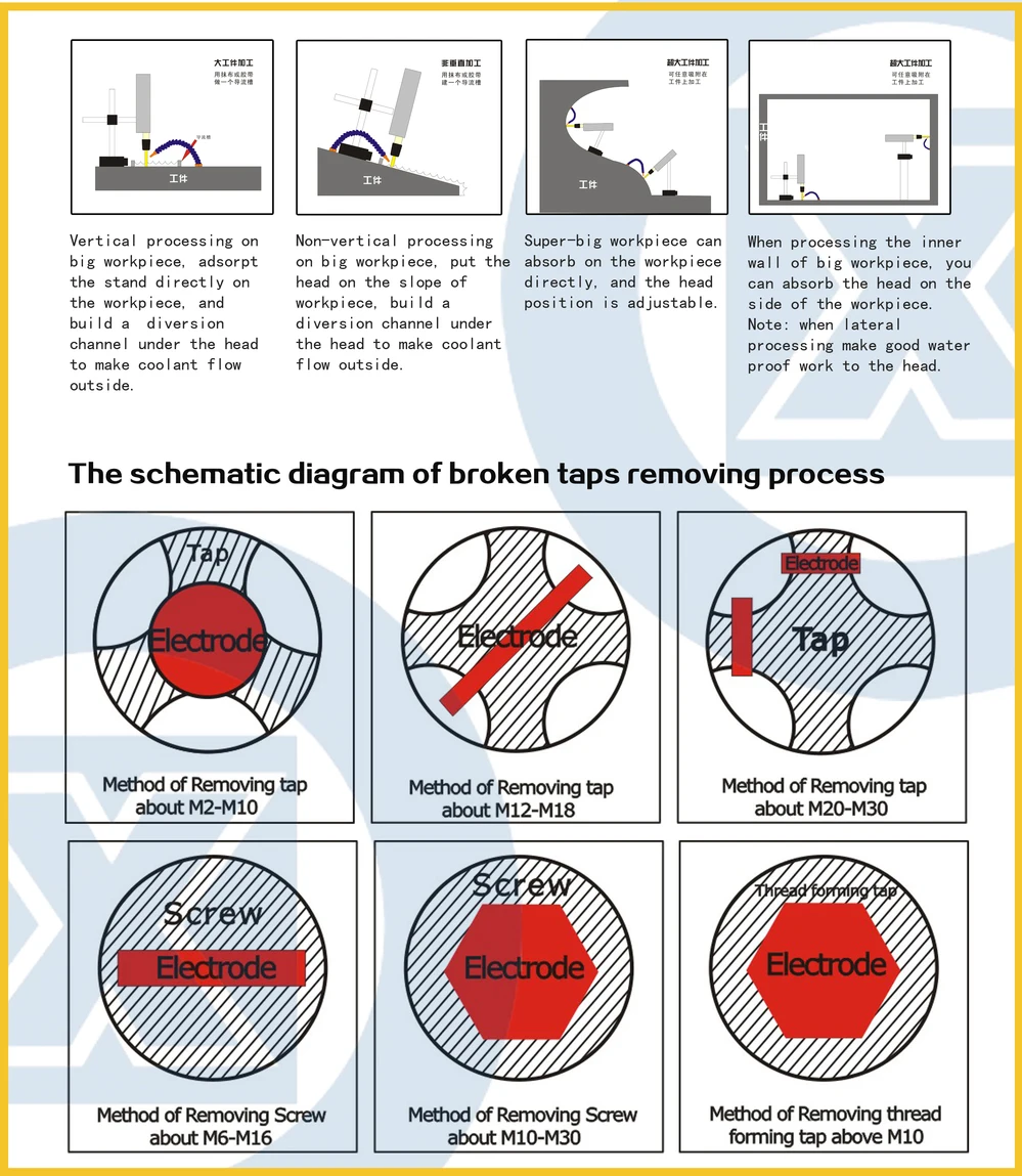Poryable EDM machine applies a magnetic base and a cross stand to support the head, it can be placed at any position, adjust the processing direction comprehensively. It can be applies on any size of work-pieces. Here are the schematic diagrams of processing methods.