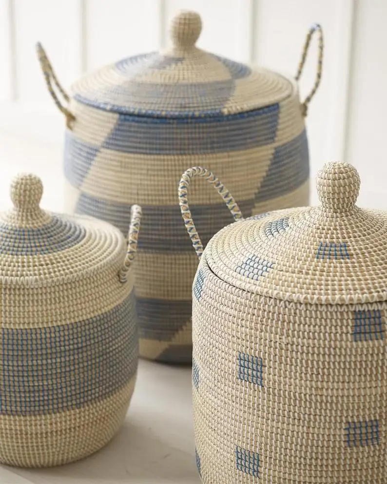 Оптовая продажа от вьетнамского производителя светло-голубой набор из 3 корзин для хранения африканских морских водорослей корзина для белья индивидуальный дизайн
