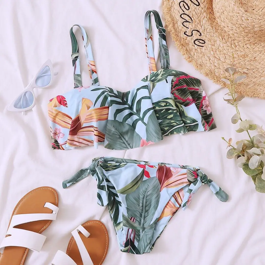 Женский пикантный купальный костюм 2021, бикини пуш-ап с оборками и бантом из трикотажной ткани для молодых девушек