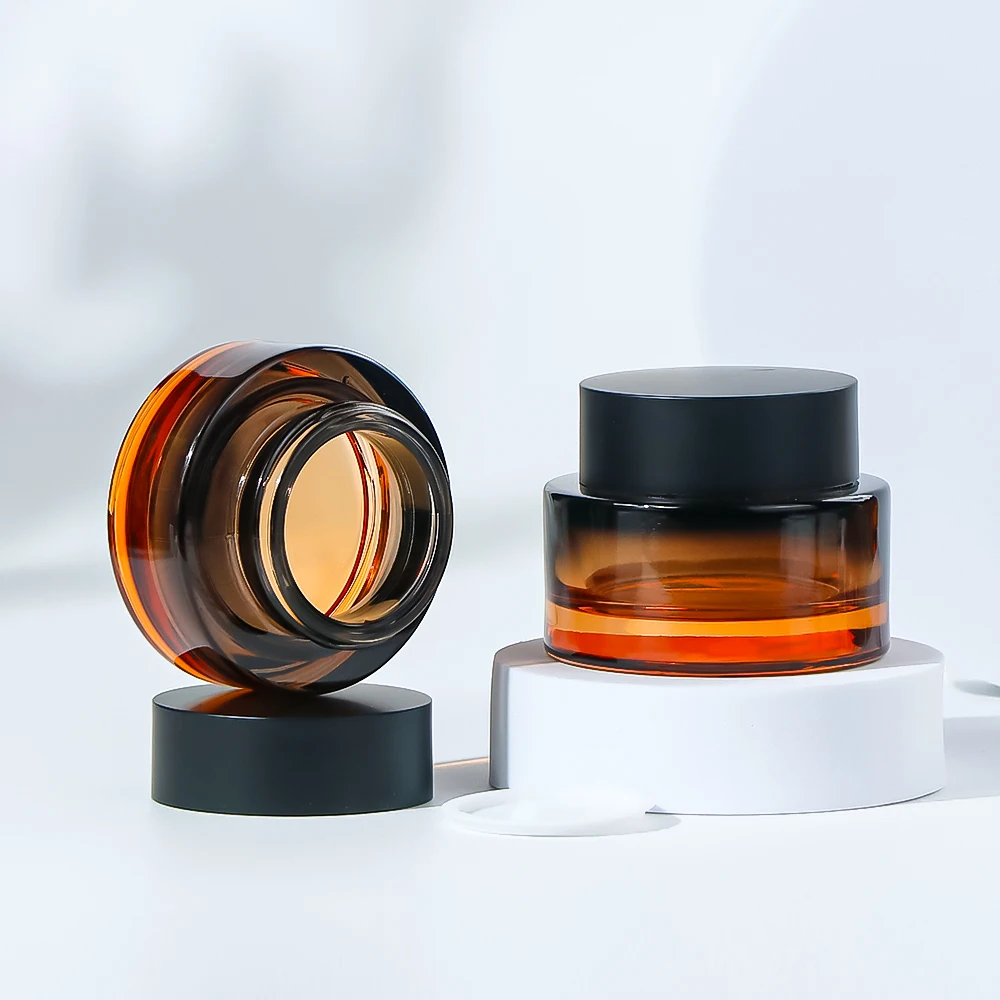 Высококачественная косметическая упаковка Янтарная стеклянная банка для крема с черной алюминиевой винтовой крышкой