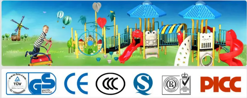 Material | 1.Plastic parts: made from LLDPE(Linea Low Density Polyethylene),safe, no lead, no smell, non-toxic and durable; 2. Steel posts: Galvanized, main support post diameter 114mm,thickness 3.5mm, all steel posts are processed with polishing, carbon-dioxide arc welding, sand-washing, galvanizing, static spraying paint and high temperature solidity. 3.Metal parts: dia32mm, thickness:2mm,stainless screws. 4.Deck: thickness 3mm,powder paint or rubber coating |