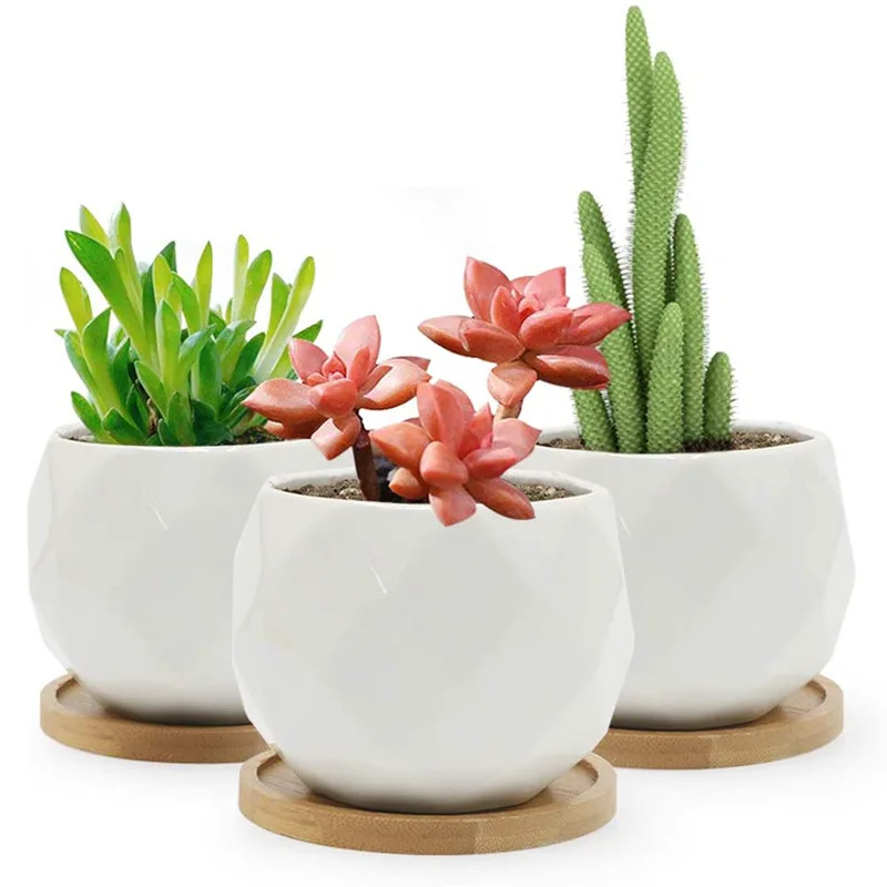 Керамический сочный цветочный горшок современный милый кактус бамбуковый поднос набор из 3 предметов оптовая продажа