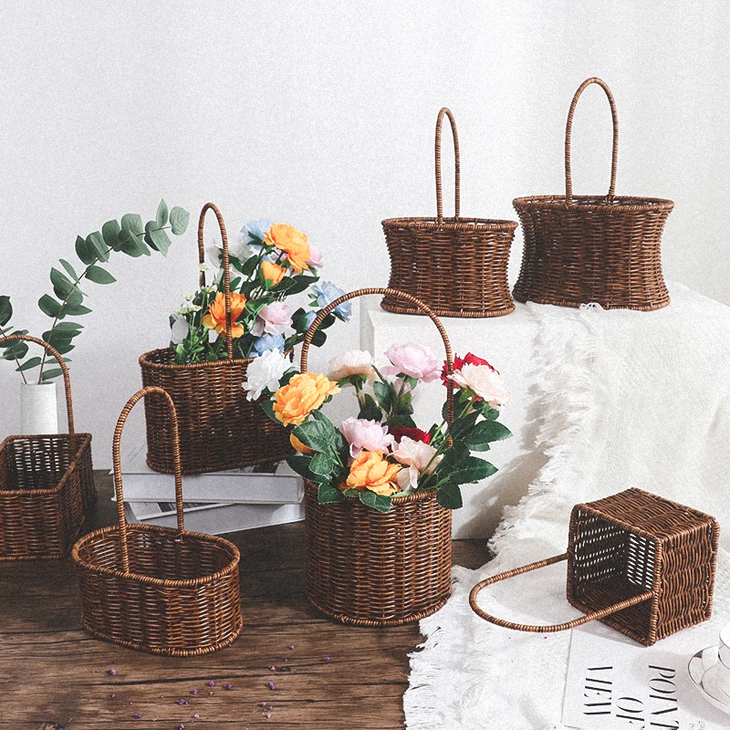 Пластиковая плетеная декоративная плетеная корзина для пикника, садовые подвесные корзины для цветов, корзина для растений и цветов с ручкой